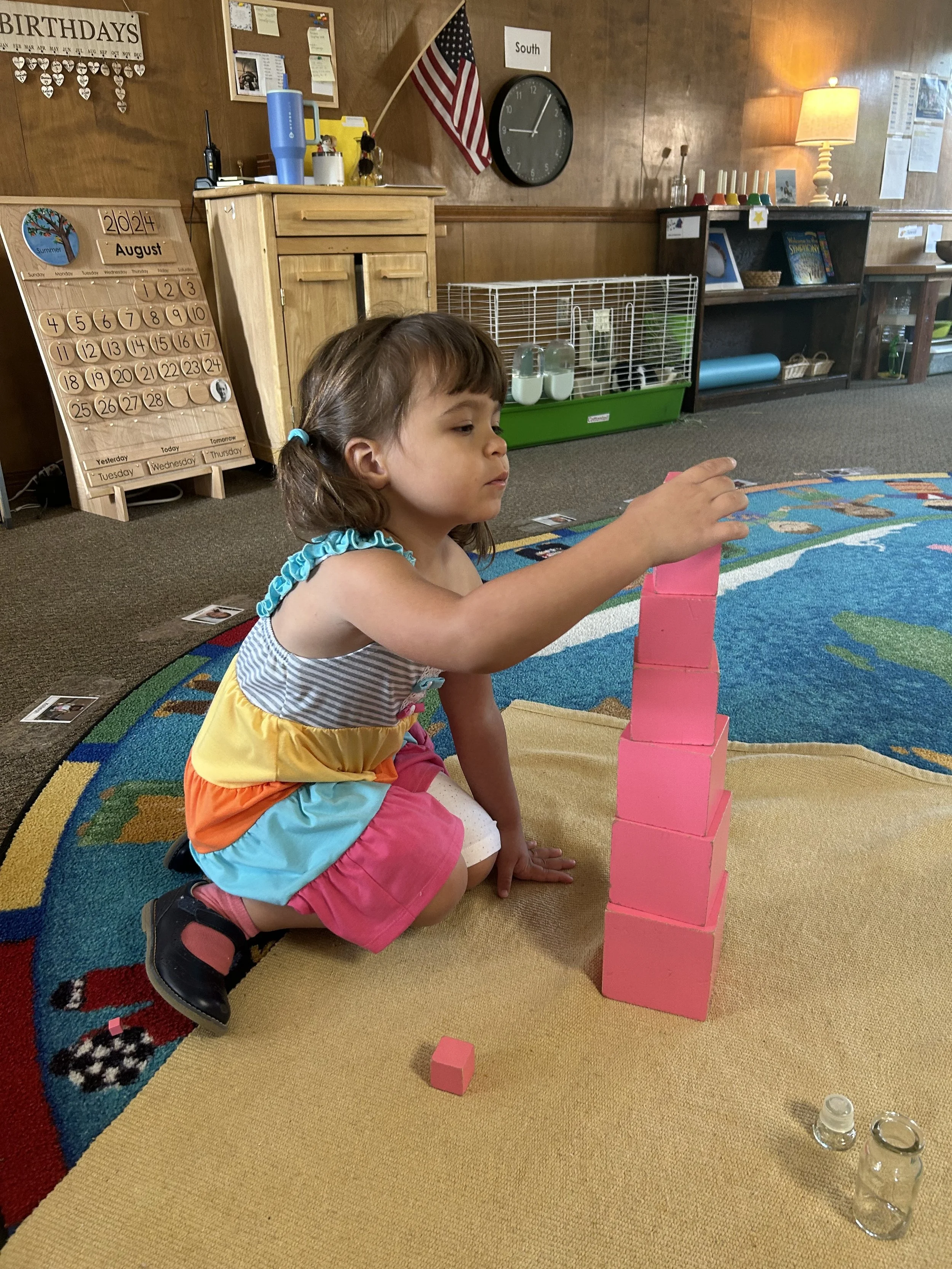 A Children’s House child is working on the Pink Tower with quiet focus, carefully stacking the cubes from largest to smallest. Her hands move deliberately, adjusting each piece until it sits perfectly. Through this purposeful work, she develops visual discrimination, fine motor coordination, and sustained concentration, all while experiencing the satisfaction of mastery.
